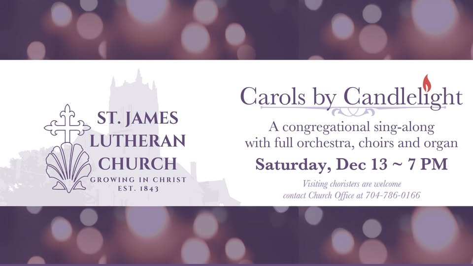 Join us for a congregational sing-along of Advent and Christmas Carols accompanied by full Orchestra, Organ and the Parish & Bell Choirs of St. James Lutheran Church on Saturday, December 13th at 7pm.